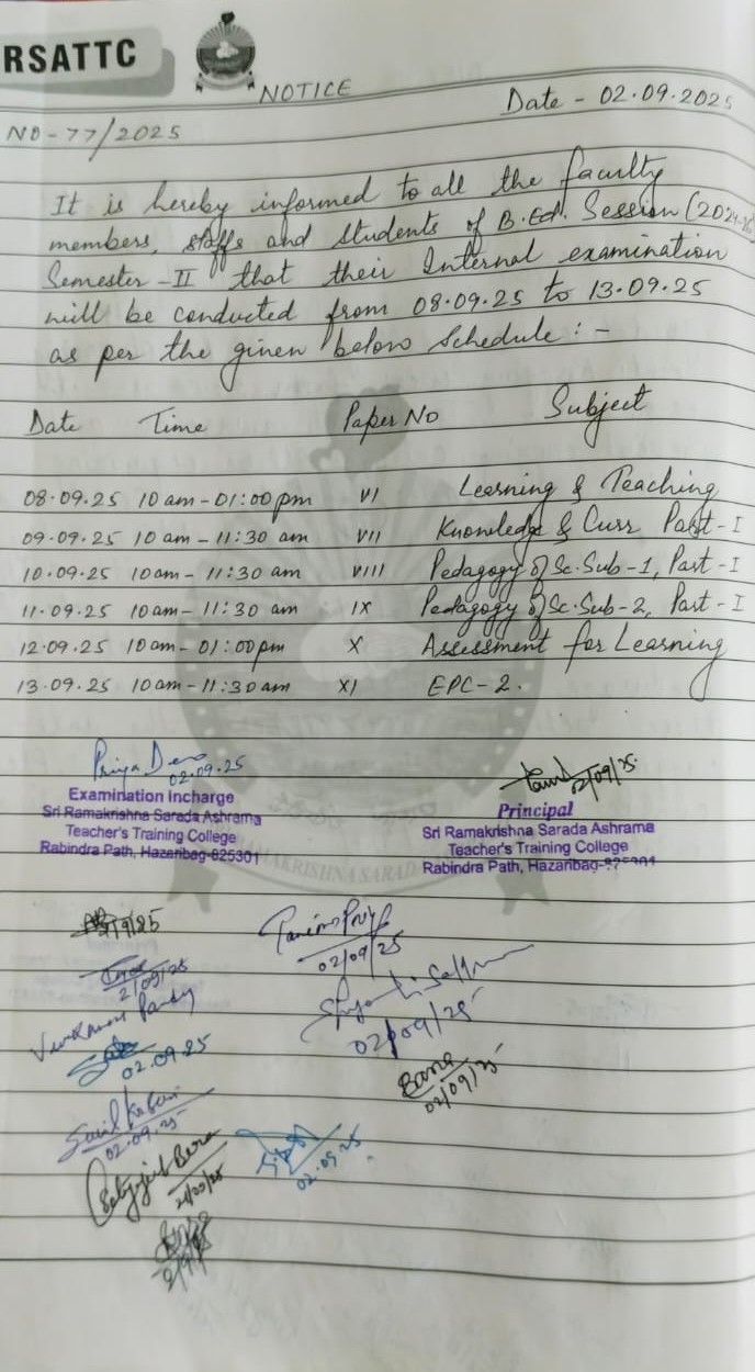 It is hereby informed to all faculty member, staff and students of B.Ed. session 2024 - 26, that the second semester classes will be continued from 26th Aug2025. Hence all the concerned students are instructed to attend the classes regularly. Timing - 09:30 am to 03:30 pm |